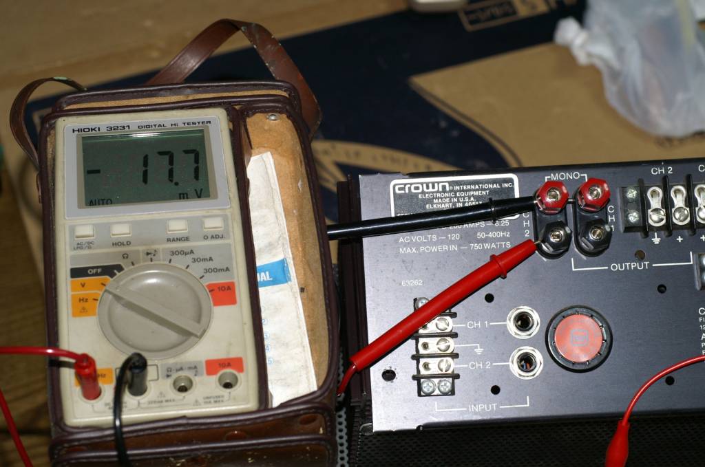 | 調整中の様子。 調整の方法は、この状態で入力オフセットとDCオフセットをそれぞれ調整し、入力レベルボリュームを最小、最大にしても電圧が殆ど変わらないように調整します。 多少のずれは生じますが、差異は2mV以内に収めた方が良いでしょう。 |
