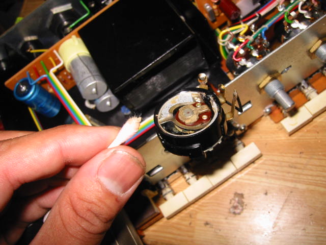 | さて、故障箇所はここで、バランスつまみが動作しないというもの。 スライド型のつまみの先端にU字型の部品がついているわけですが、ボリュームのシャフトが固着しかかりで非常に重く、動作を繰り返すたびに疲労し折れたようです。 |