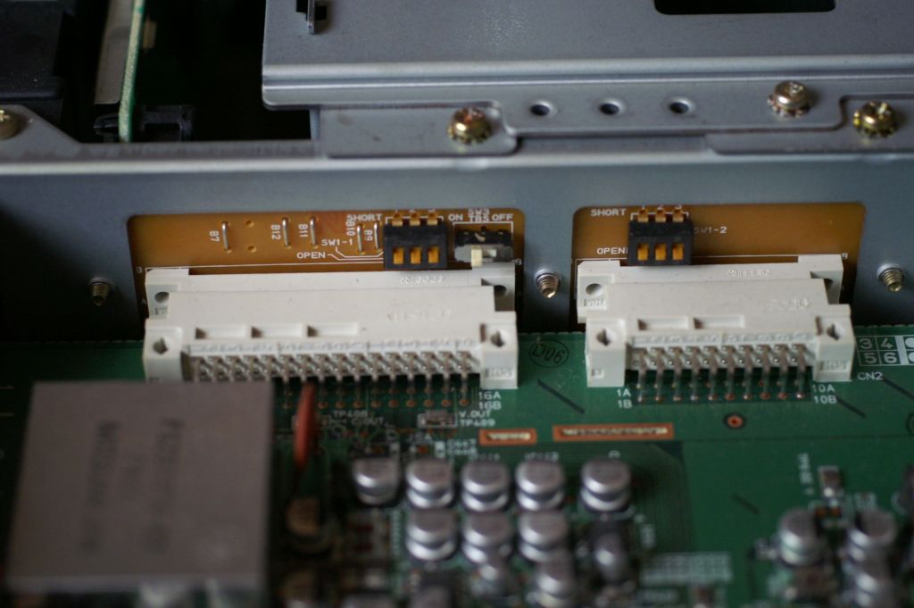 リアパネル。 業務用といえど、必要最小限の機能だけになっています。 この辺は上位機種には負けていますね。 ちなみにS500DXなので本当に少ないです。 オプションスロット2個はすでにボードが入っています。 |