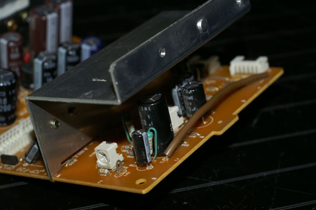 これはS500DXの基板ですが、S800DXの基板は一番手前の電解コンデンサ、1000uF/25Vがだいぶ成長していました。 S500DXの基板はそう成長はしてなさそうですが、微妙な感じです。 |