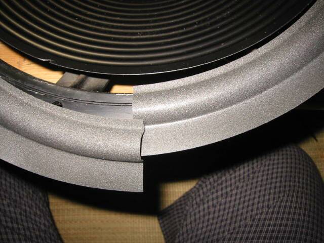 スピーカーにエッジをあてがって、1カ所完全に切り離してしまいます。 そして、エッジをコーンにきちんとあてて切断場所を確認してから、不要部分を切り落とします。 |