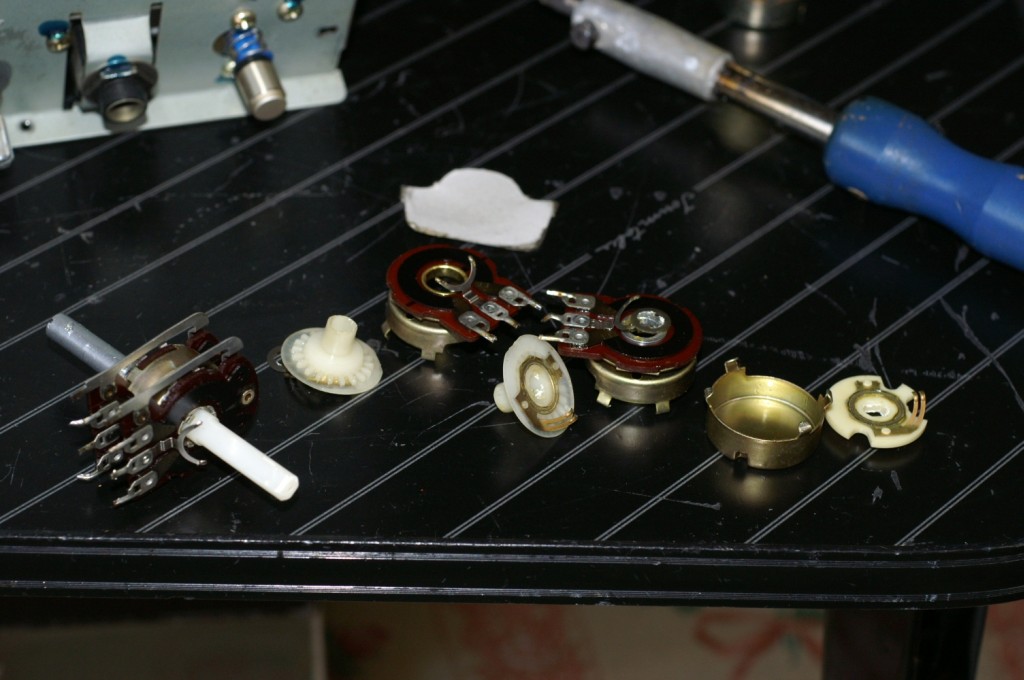 | メインボリュームの分解清掃を行っているところ。 分解は出来るつくりですが、やりたくないですね・・・(汗) |