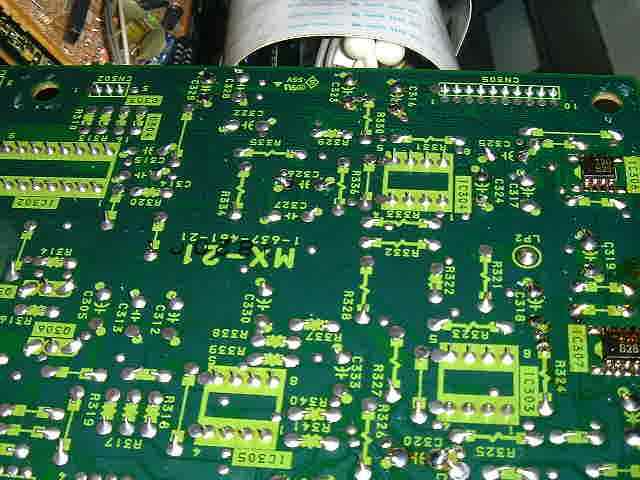プラグインの音声サブ基板。前のSVO−260でも、この基板の一部の電解コンデンサも噴いていましたがこのデッキは交換済み。
