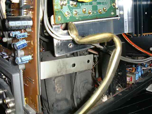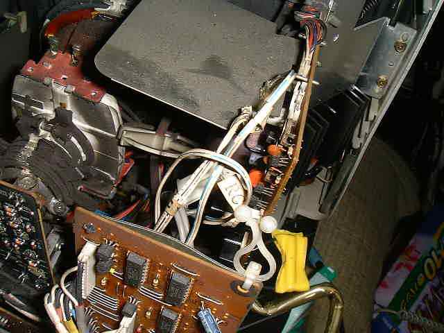流石に内部は汚いっすね・・・。真ん中に見える銅色の部品は偏向コイル。