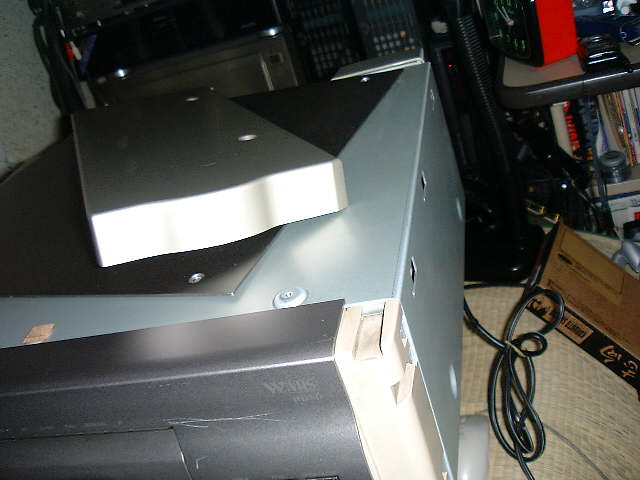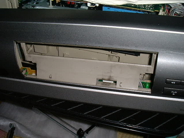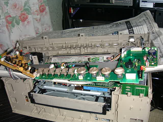無事にパネルを起こしたところ。他社のように、パネルを分離すれば良いのですがビクターさんは配線のインシュロック止めが大好き。これを切るのもめんどうなので、デッキ上に新聞紙を広げてそこで作業をすることに。