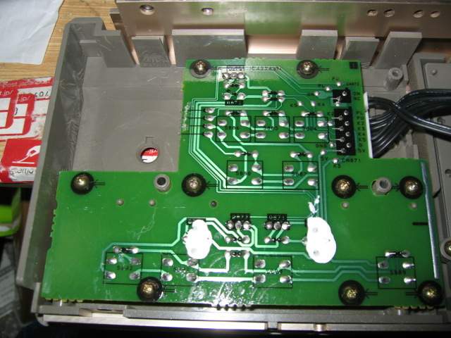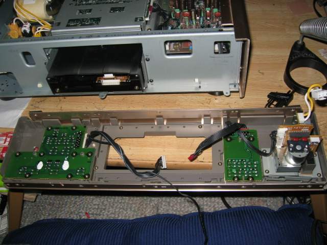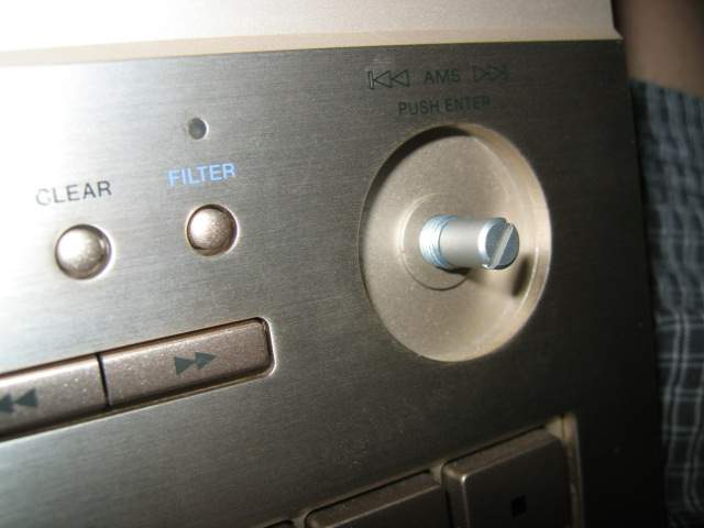 | 既にこの写真ではAMSつまみを取り払っています。 とりあえず部品破損は解っていたので、何故かAMS操作基板だけ別になっているのでとりあえず切り離してみたところ、キー操作に反応し、トレイも開いて再生するようになりました。 多分エンターが押されたままになって破損していたと推測されます。 |